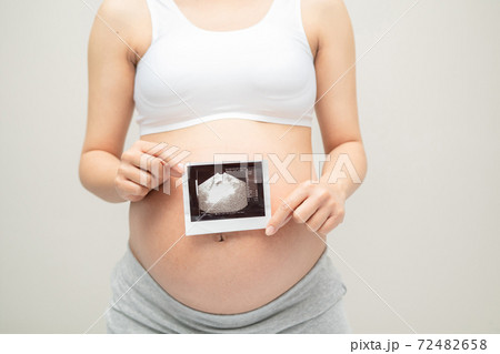 Pregnant girl shows an ultrasound photo of her undorn baby. Portrait of a child on an ultrasound photo