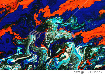 Liquid marbling paint background in orange. blue and turquoise colors.