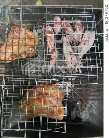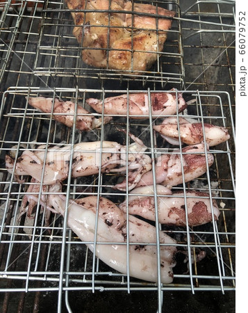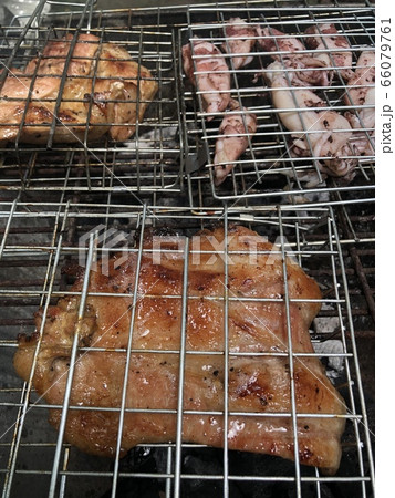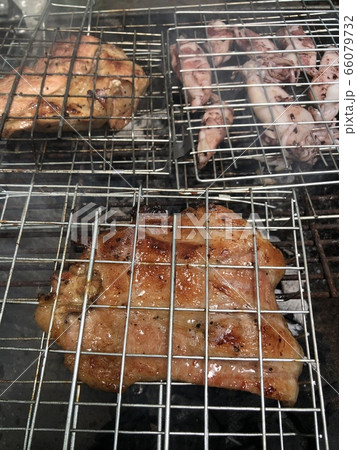 Squid and pork necks grilling on a charcoal grill Grilling is popular among Thais for parties to add fun and hilarity.