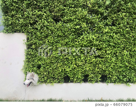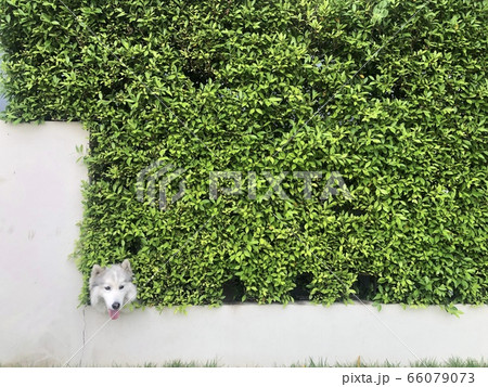 The white-haired Siberian Hucky breed of dog, a mischievous pet, plays its head outside the tree wall. It is very cute to the people who see