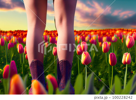 the feet of a young girl stand in a clearing dotted with flowers.