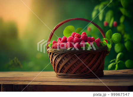 a wicker basket with raspberries stands on the table against the backdrop of a green garden.