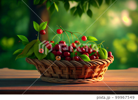 a wicker basket with cherries stands on the table against the backdrop of a cherry orchard.