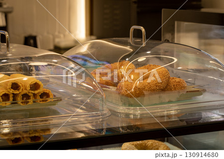Fragment of glass showcase with sweets in coffee shop, close-up, selective focus.