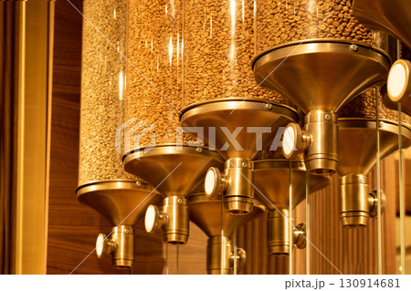 Decorative glass containers with taps for coffee beans in a coffee shop, selective focus.