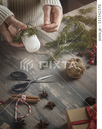 Female hands making atmospheric Christmas decoration with candle, spruce needles, jute twine on a wooden table, vertical image.