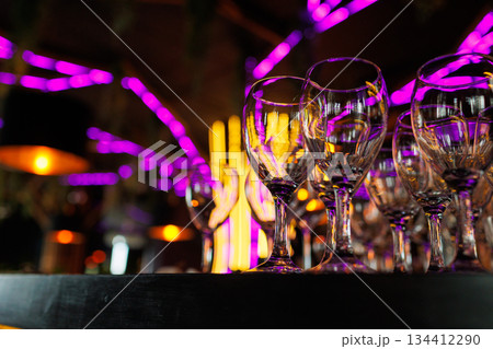 Empty clear wineglasses stand in rows on bar counter at nightclub, blurred purple neon and yellow lights on background. Clean cocktail glasses ready for celebrate party.