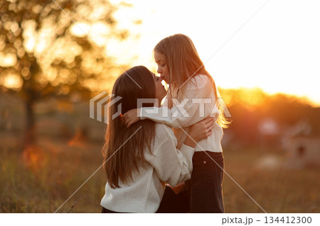 Family day, mother's day. Happy smiling young mom and adorable child daughter soft hugging, kissing and spending time together at autumn on sunset. Idyllic family having fun outdoors on fall holiday.