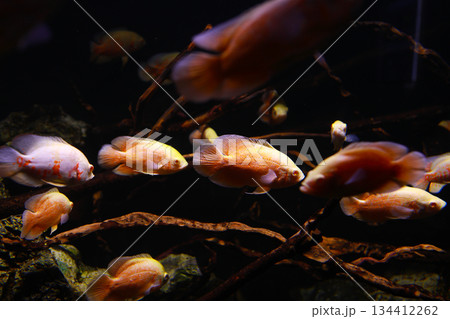 Close up white- orange ornamental fishes swimming inside freshwater aquarium. Aquatic environment of fish tank with soft artificial lighting and wooden branches decor. dark theme. Concept of pet care