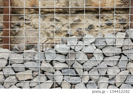 Stone fence in steel mesh and green lawn. Close up of gabion with tightly packed stones of varying sizes and textures. Combination of natural materials and industrial design.