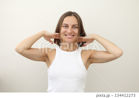 Portrait of young smiling caucasian european attractive woman 30s with straight-shoulder length brown hair in white tank top looking at camera isolated on light background. People lifestyle concept.