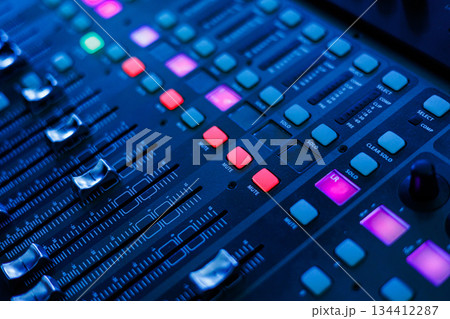 Concert sound mixer panel with volume regulators. Professional audio and light equipment for sound recording studio, live music broadcasting, television, party. mixing console. audio signals