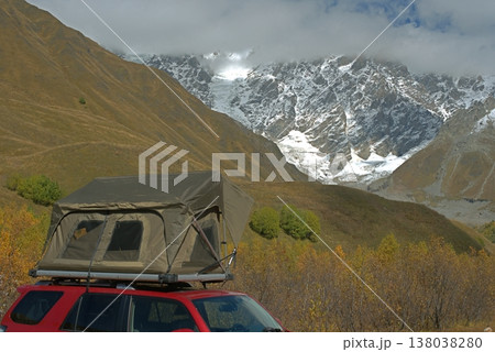 A car camping tent on the roof of an SUV in the mountains in autumn