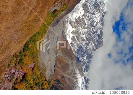 Chalaadi Glacier, ice, moraine and snow in the Caucasus Mountains in autumn, Mestia, Svaneti, Georgia.
