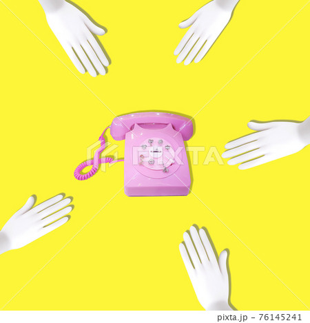 Pink retro telephone with a receiver on a wire on a yellow background there are hands around.