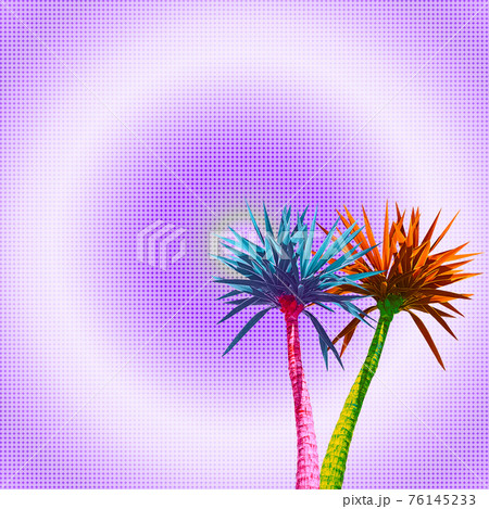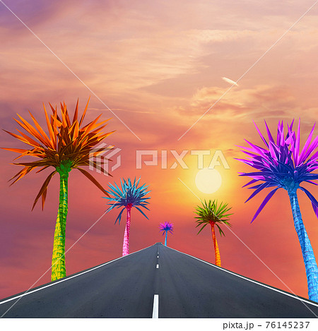 Abstract bright multicolored palms on the background of the road and sky with the sunset.
