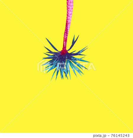 Contemporary collage. 3D illustration. White flamingo behind a leaf of a palm tree on a yellow background.