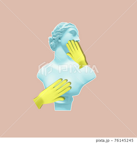 A sculpture of a woman on a beige background and yellow hands covering her chest and mouth.