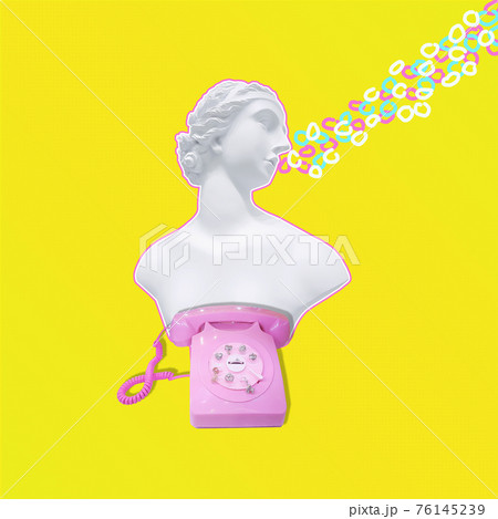 Contemporary collage. Greek goddess in sunbeams on an orange background.