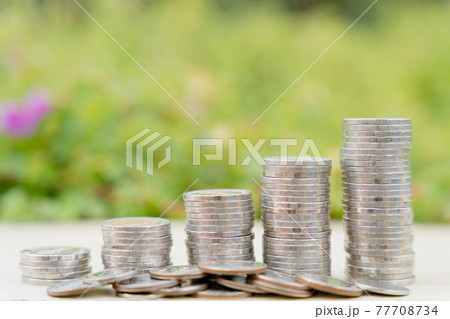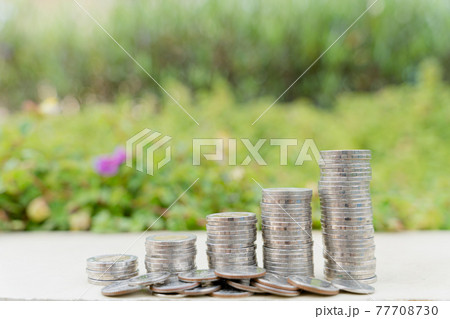 Stack coins on blurred green natural background. Property investment and house mortgage financial concept.