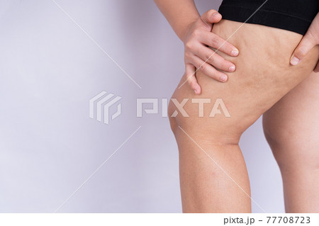 Female holding and pushing the skin of the legs cellulite or orange peel. Treatment and disposal of excess weight, the deposition of subcutaneous fat tissue