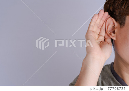 man hearing loss or hard of hearing and cupping his hand behind his ear isolate grey background, Deaf concept.