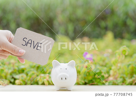 Piggy bank on blurred green natural background. Saving money and investment concept.