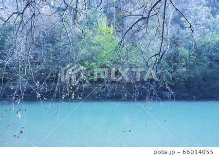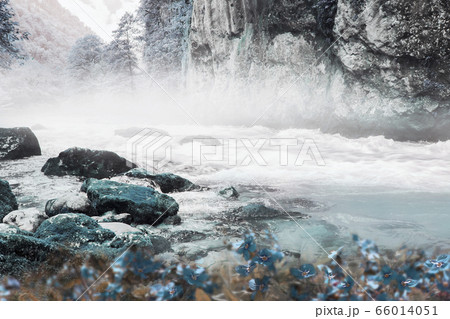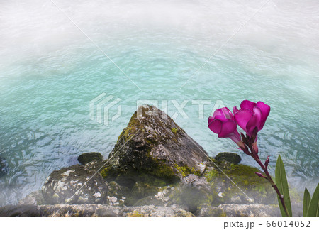 Oleander flower with leaves, rocky coast against the backdrop of a raging mountain river
