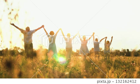 happy family, parents man woman holding children hands sunset park, mother father parents kid outdoors nature, backlit kids standing hand in hand, sunlit silhouettes of children together, family unity