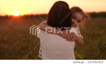Mother child comforting sad daughter at sunset, emotional family moment outdoors, girl child kid hugging mom after a long day, loving embrace nature, parent child support during hard times, expressing