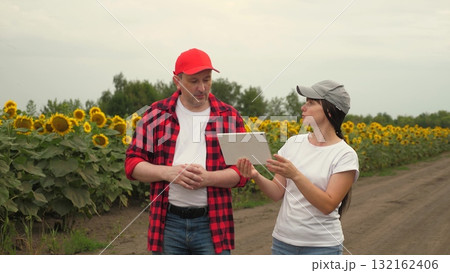 Agriculture, farmer typing digital tablet, male farmer sunflower field, male working sunflower field, industry male female worker cap, agricultural concept, smart farm, male working field, farmer face
