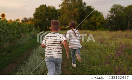 Children running together in nature, Kids playing in the countryside, Childhood friendship in the sunflower field, Summer evening outdoor activities, Happy children enjoying freedom, Boy and girl