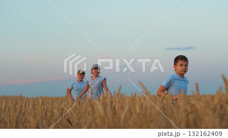 Child kids running through wheat field, run children group boy girl wheat field, agriculture, friends outdoors, people nature, children's summer dreams on a farm, childhood friends in a meadow, joy