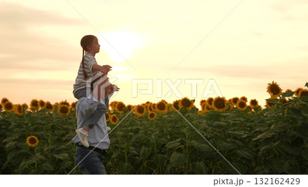 Father and daughter in sunflower field at sunset, happy family in summer, dad carrying child on shoulders, sunny day in nature, enjoying time together outdoors, bonding in the countryside, beautiful