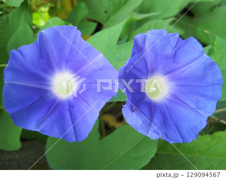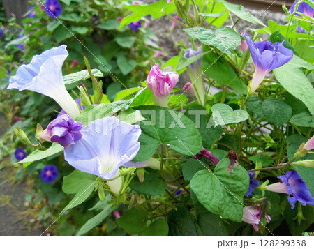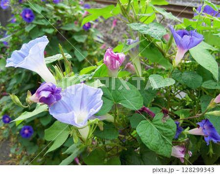 盛開的深藍紫色牽牛花和淺藍紫色牽牛花
