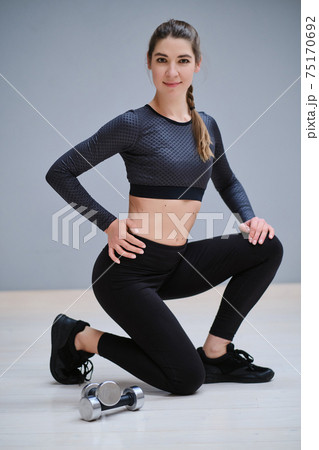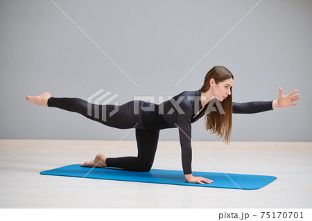 Beautiful young girl in sportswear is engaged in fitness on a gymnastic carpet. The girl does sports training, sports. Fitness woman