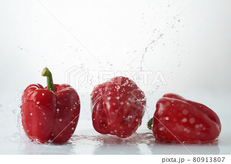 Fresh peppers falling into clear water. Fresh red pepper in a splash of water on a white background.