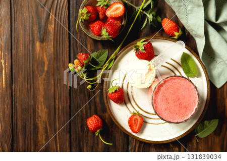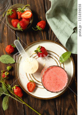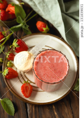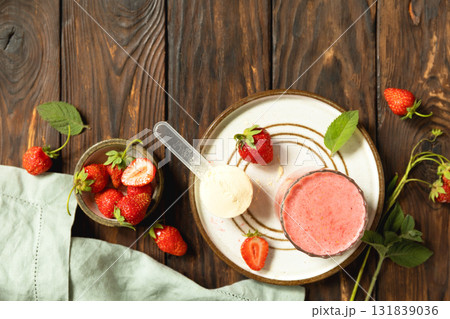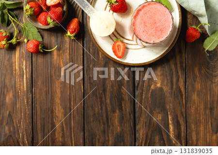 Fresh strawberry protein smoothie on a wooden table with fresh strawberries and a protein powder. Copy space.