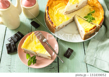 Delicious lemon cheesecake with tea set for dessert presentation.