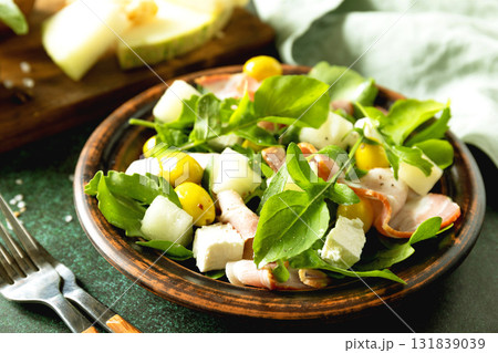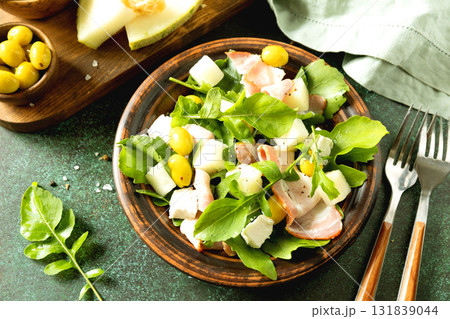 Fresh arugula salad with prosciutto, melon, and olives for a delicious summer meal. Copy space.