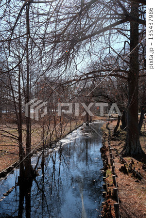 灌溉水道兩旁光禿禿的樹木,湛藍的冬天天空和潔白的雲朵。