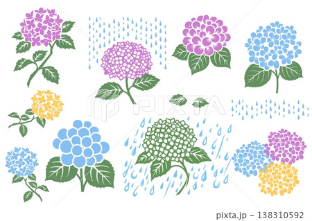 一組色彩鮮豔、木版畫風格的繡球花和雨滴插圖,描繪了雨季的景象。