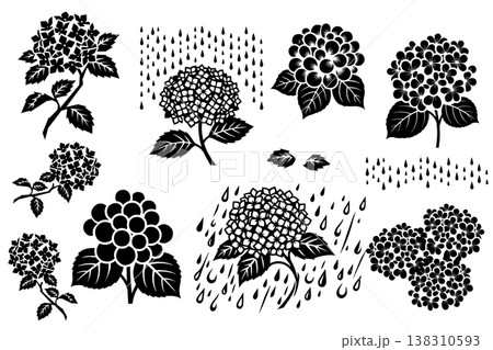 一組單色剪影插圖,描繪了繡球花和雨滴,採用木版畫風格。