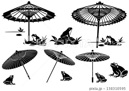 一組以木版畫風格繪製的日式雨傘和青蛙的單色剪影插圖。