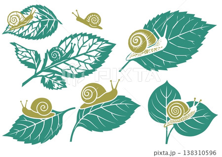 一組以蝸牛和綠葉為主題的插圖,非常適合雨季。