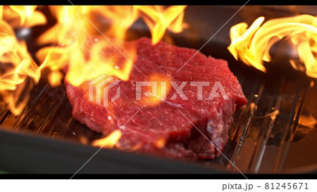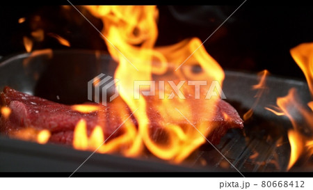 Super slowmotion footage of flambe fresh beef meat and seasoning on ignited pan, 1000fps 4k
