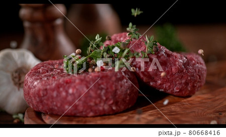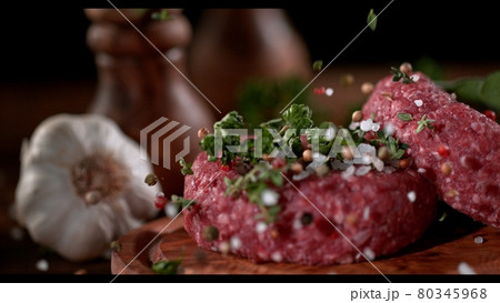 Super slowmotion footage of strewing salt and herbs at fresh raw beef meat burger, 1000fps