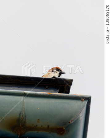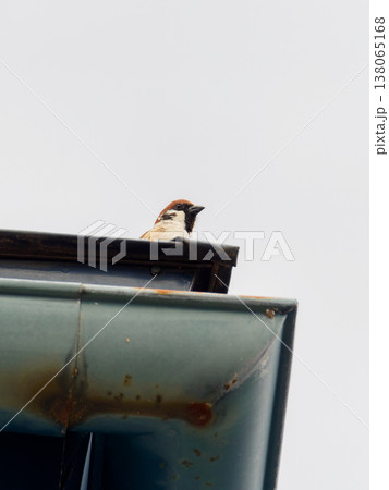 一隻麻雀從屋頂上環顧四周。