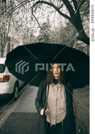 Emotional portrait, girl with umbrella, emotion - reaction to surprise, fright