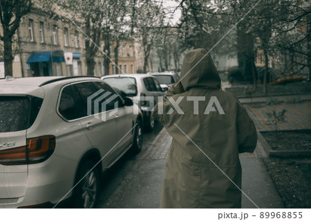 Traveling young woman in green raincoat with hood walking down street